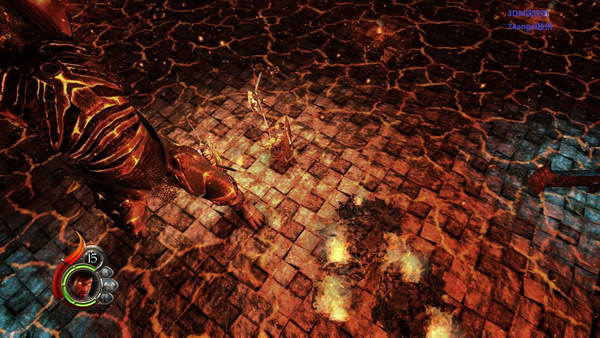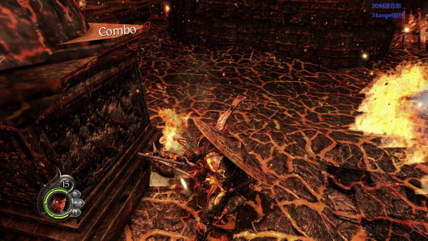 往前走几部进入冥界模式,然后清理掉所有的骷髅以后恢复正常在杀掉所有卫兵,推开囚车挡住的路。然后又进入了冥界模式速度清理后,打开门,穿过广场,过一关CG一直后就会出现一个超级大BOSS,有点难度,他站着的时候,对着他的腿猛K,他趴下来以后,就用火球打打他头,注意他放技能的时间。