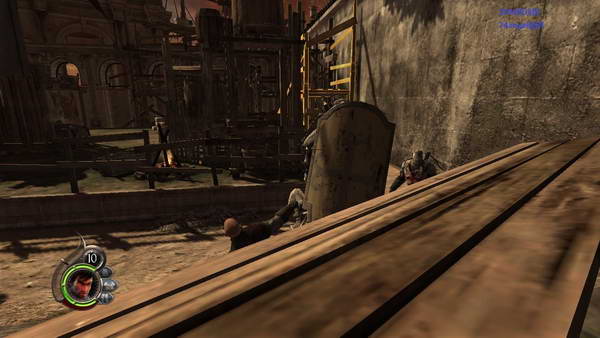 清理广场的所有小兵,然后把铁门打开。一路往前走,在同伴的协助爬上哪个围栏断开的台子上面去。这里又看到自己士兵又被SM了,赶紧去帮忙!解决冲过来一帮士兵!