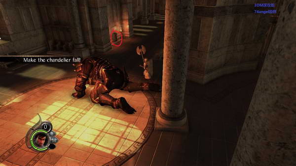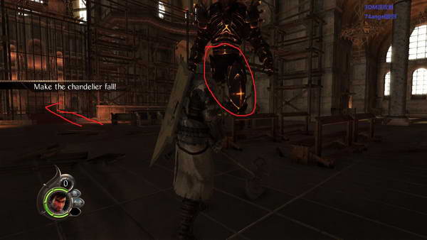 注意我第一张图片表示位置,箭头方向和BOSS后面有一小圆厅,把BOSS带过去,然后朝着他腿猛砍,然后按下旁边的机关,让吊灯掉下来压死他。