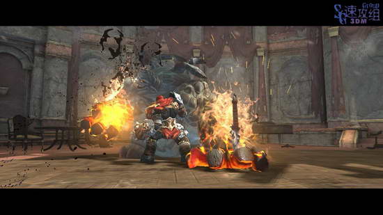 楼上大厅这里有很多丧尸,还有个火怪。丧失还是普通的秒杀掉,火怪也不算难打,看透他的攻击方式就好,上去砍几刀,看他快要攻击的时候立刻冲刺到他的左边或者右边,不要从到前边,不然有很大几率悲剧,看准他每次攻击后的间歇,过去砍上几刀,不要贪刀,砍几刀看着他要打了就闪。他死的时候会自爆,躲远点就行。