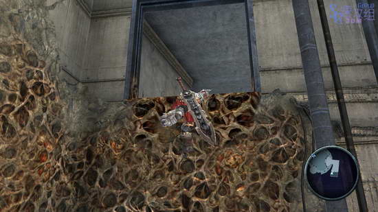 接下来我们回到了地球,从网子爬上来,是个停车场,一直向楼上走,途中楼梯会断开,跳过去。图中的地方要抓墙跳过去。