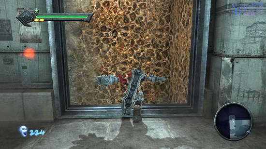 左边这里的箱子,来到地下后从墙上的网子一路爬到对面箱子处,不过网子上会有些锤子似的东西攻击我们,一路按A加速过去,这样就没问题了。