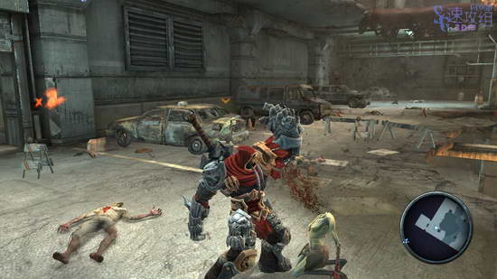 这里的大厅又是有很多丧尸,先杀一些丧尸之后会出来大怪,看着不小,很强的样子,实际上很废。攻击方式有三种,冲刺挥拳,向左或右冲刺就能躲开。