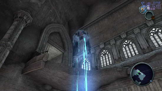 从墙上爬到二楼,把石像从楼上踹下去,地上砸了个大洞,跳到洞里。