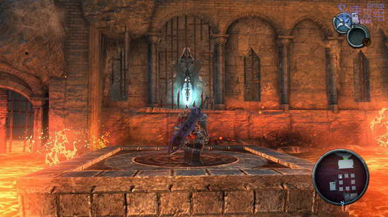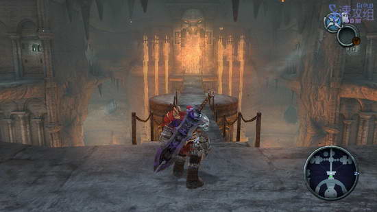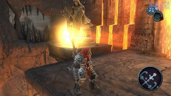 来到中间的两个石像之间,用飞刃一次性瞄准两个,启动后前面的岩浆瀑布会消失,进去后拔出剑来,原路返回三个石像的大厅,给其中一个石像插上剑。