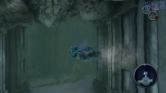 水中有两个机关石台的地方,第一个不用管,第二个游过去,用剑打一下机关后立刻跳到石台上,然后石台升起,我们跳到对面的门那里进去。