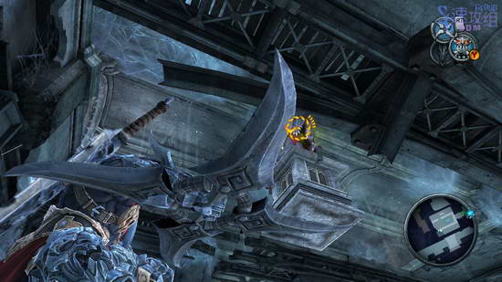 接下来的房间右边是装着钥匙的箱子,走左边爬上网子后用锁链荡秋千到时间机器那里换成飞刃启动机器,然后换回锁链荡秋千荡回去,第一个松手之后在按下RT抓住下一个最后落到箱子附近,开箱子拿钥匙后用飞刃攻击两个天花板的怪,然后跳出去解开房间的封印,出去。