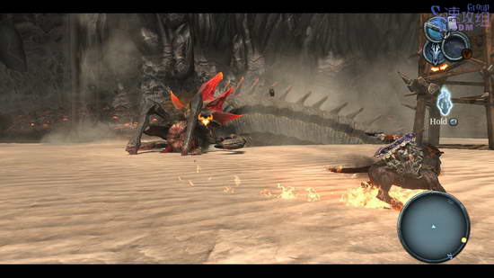最后来到沙地竞技场,一开始会出现一个骑马的敌人,很好打,对着他砍就行,他挥刀的时候冲刺躲开,他的门两脚离地时我们也躲开,然后突刺,打他几次之后又会出来其他几个骑马的,地上一个喷火口会打开,一旦有人过去就会喷火,把骑马的引过去打。