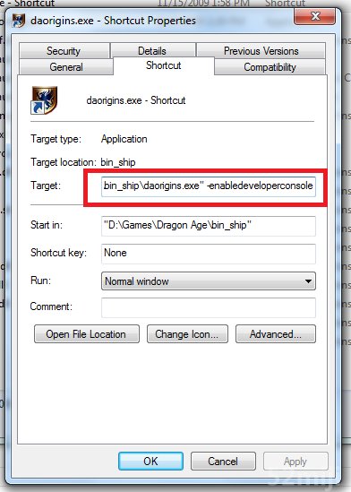 例如: "C:GamesDragon Agebin_shipdaorigins.exe" -enabledeveloperconsole