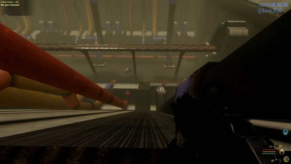 游戏开始之后所在的房间中只有一扇门,从房间出去后一直前进,可以在地上捡到手枪,默认是回车键,比较别扭,其他的控制和普通FPS差不多的。