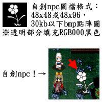 流程:进入游戏→F8→make custom NPC→汇入npc样板与图档。 图档相关与格式范本: