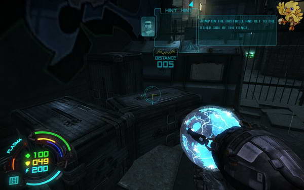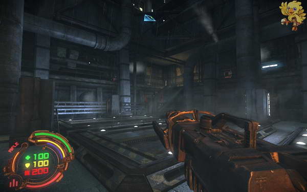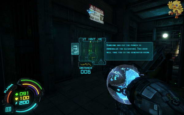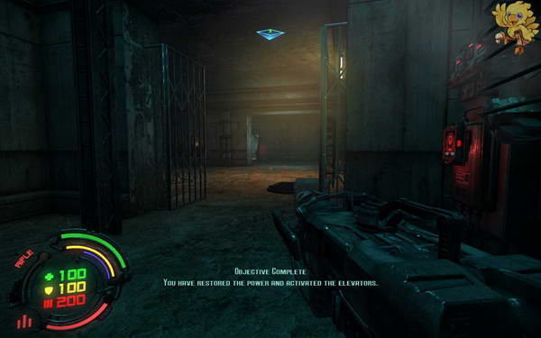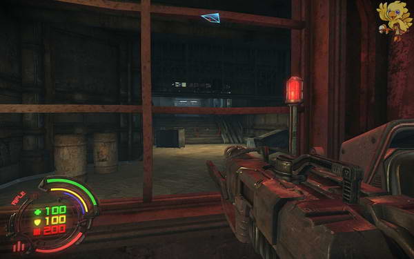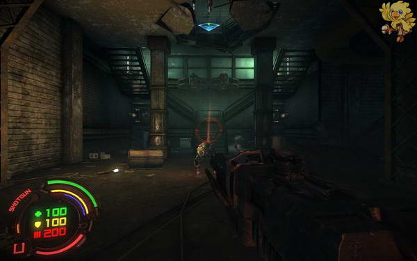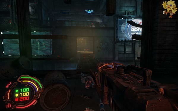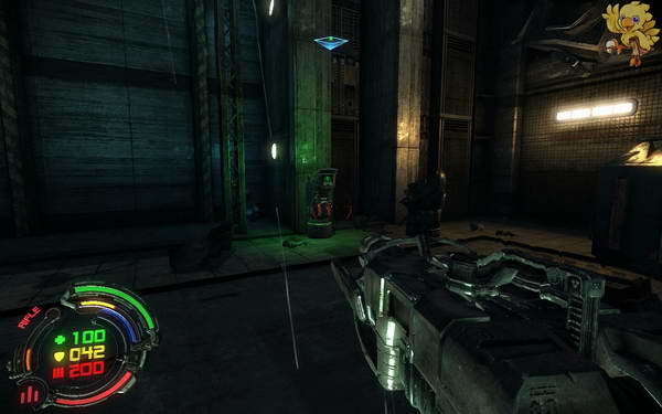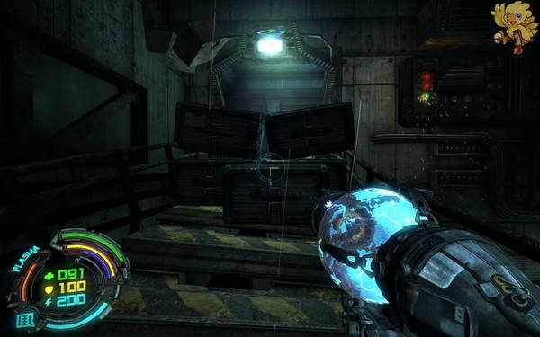 第二关一开始从这梯子上去,上去后会有机器人来围攻,清理掉后走到前面,有个门上下浮动,进不去,过来打开旁边的控制器,进去旁边的门,打开里面的开关,前面的门就打开了。