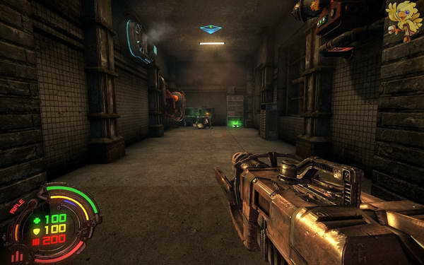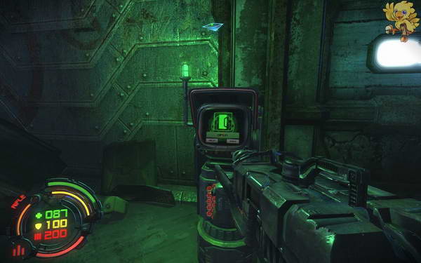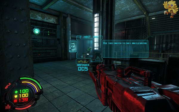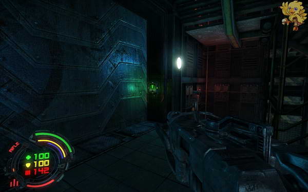 打开后我们还是往前面走,走过桥进门就会看见前面有个绿色电梯按钮,按下去上面的电梯会降下来,然后进去,此时会有很多小怪围攻过来,出电梯准备好作战吧。