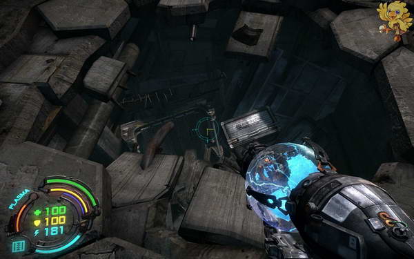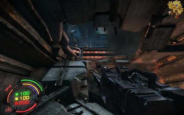 上去后一路清理机器人,看见前面有个光球,从左边的路进去,往前走会看见一个断桥,那里有补给,补给好上来,旁边的一个小铁门是关闭着的,我们就往前面的桥走,去打开开关。