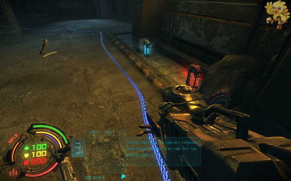 下去后杀几个小机器人,看见前面有条路是有电封闭住了,我们就沿着地上的线一直往前面走,一边清理怪一边走,走到前面会看到发动机,关闭它。