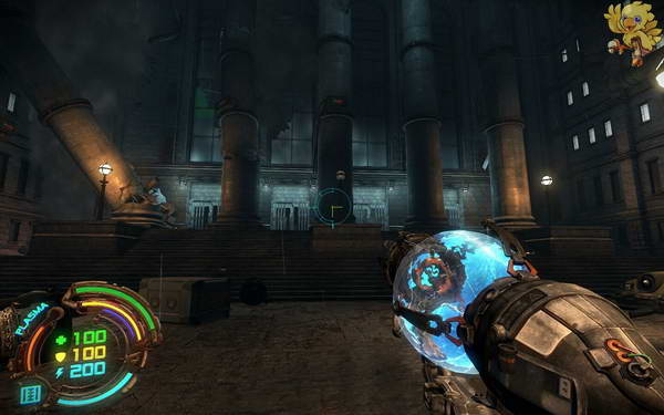 下去后往前面走,又会蹦出小机器人,打掉后,旁边的集装箱也会出来人形机器人,都清理掉后就去前面有很多石柱的建筑门口,上去梯子会出来两个boss,这boss2个都是发射导弹的,用激光枪蓄力攻击它们,打掉后,进入建筑内,结束第三关。