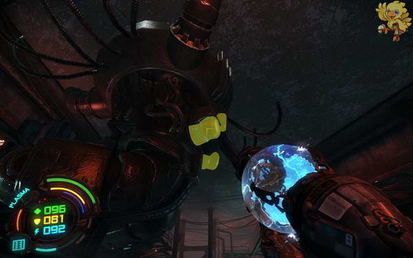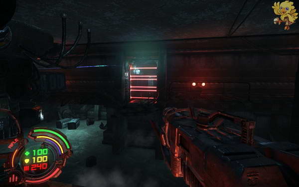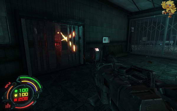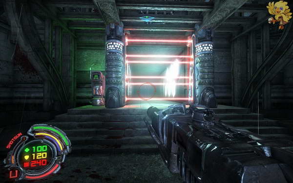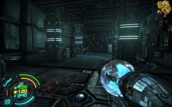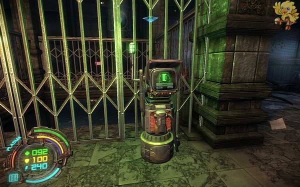 然后我们返回到刚才路被封闭的那里,这时候可以通过了,过去清理掉那些机器人,二楼也会有,清理完后,左边的门会变成绿色,打开进去。