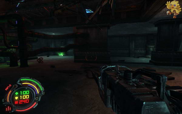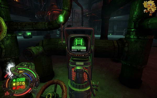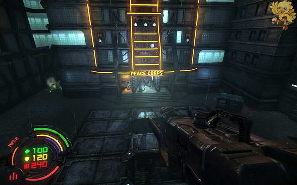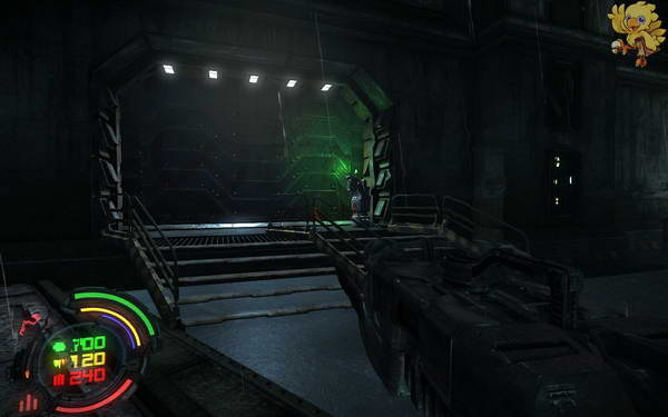 过去清理小怪,从前面的梯子上去,然后看到左边的路是 被封闭着的,我们就从右边的梯子上去,饶过去,从那边下去清理完机器人,打掉墙角边的发动机。