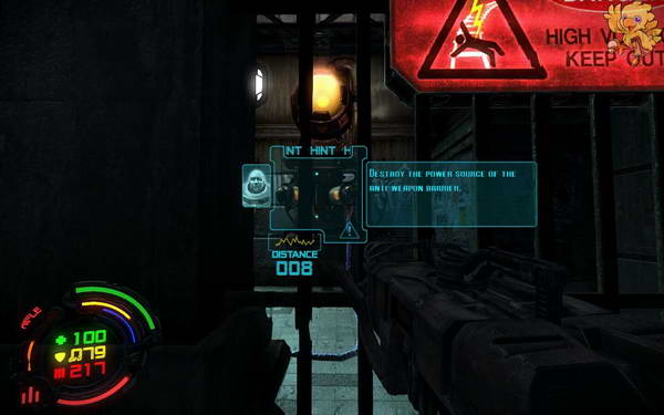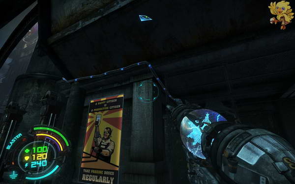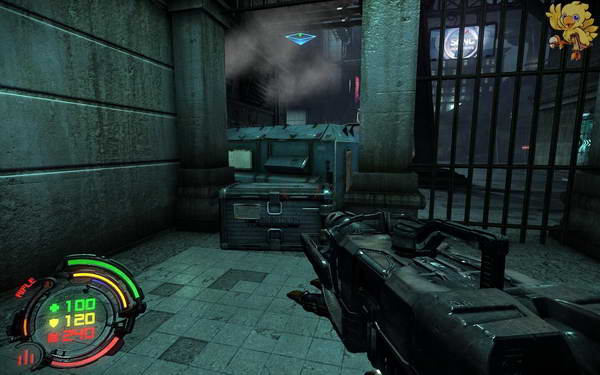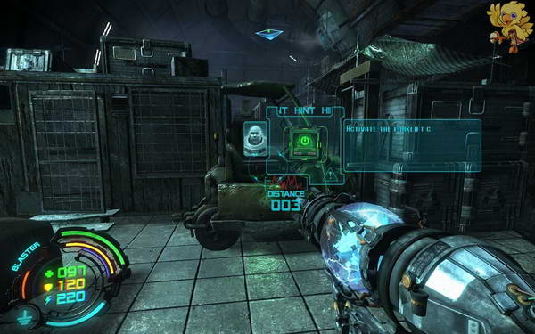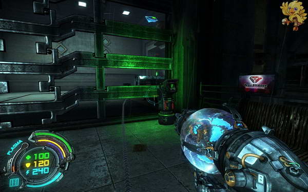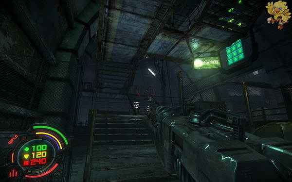 过去打掉对面的人形机器人,然后下二楼,清理完所有的小机器人,过去看见从右边的梯子上去,左边的梯子是被封闭住的。