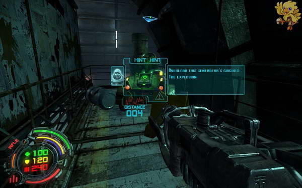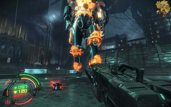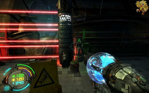 下去后又会遇见两个小boss,打掉从旁边一个有火的地方进去,可以沿着旁边的电缆看一下,等火停的那一下冲过去,打掉里面的供电器,我们就可以从旁边的梯子上去了。