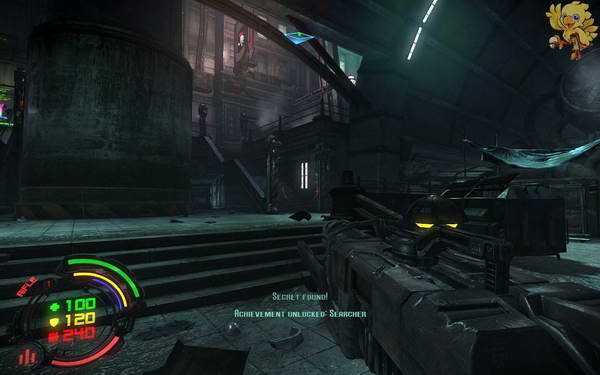 过去后前面会有两个小boss撞过来,清理掉,二楼还会有人形机器人掩护,清理完打开右边梯子旁边的开关。
