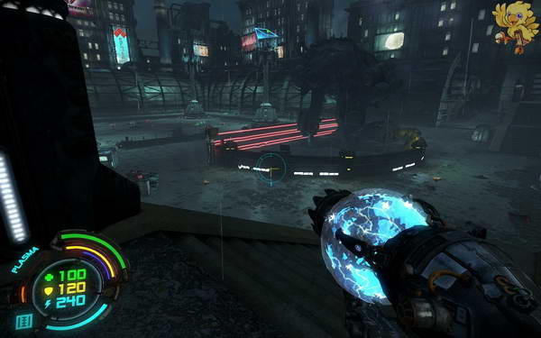 前面会冲个小boss过来,打掉他,然后去前面打坏供电器.就可以从旁边梯子下去了。