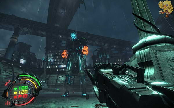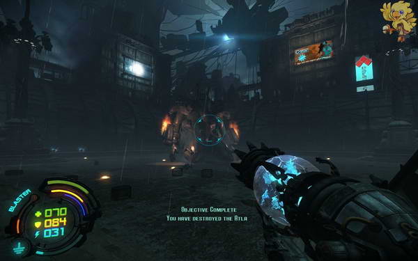 过去打掉几个小机器人,然后打开门的开关,从废墟上跳过去,到达二楼。