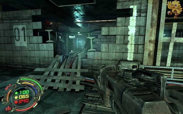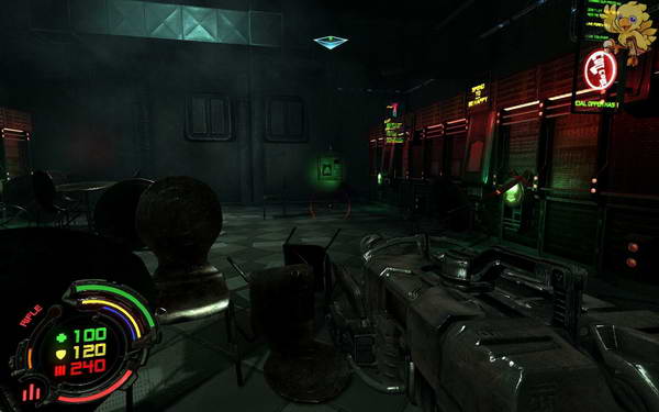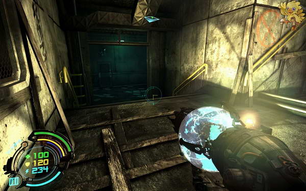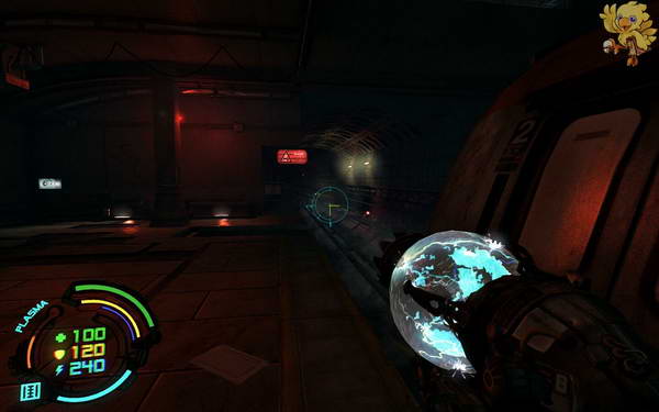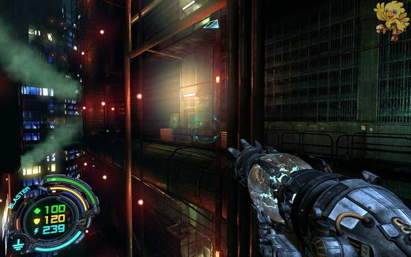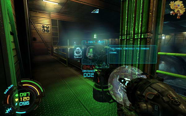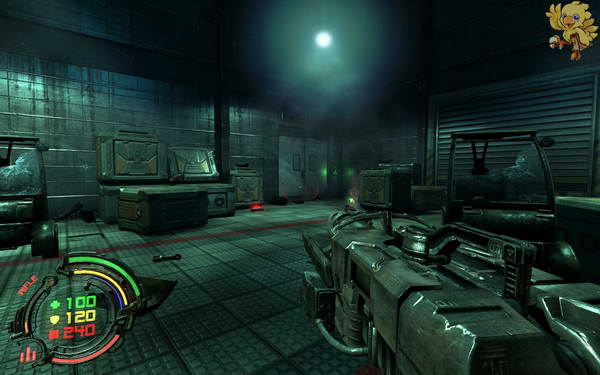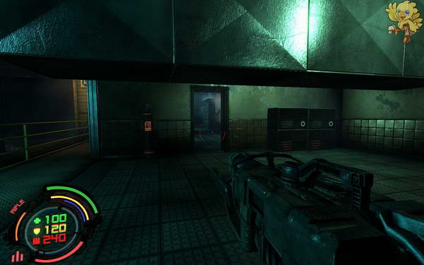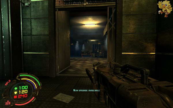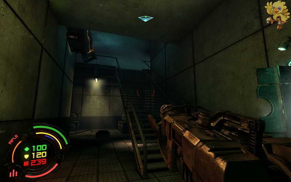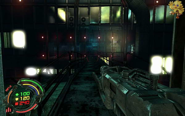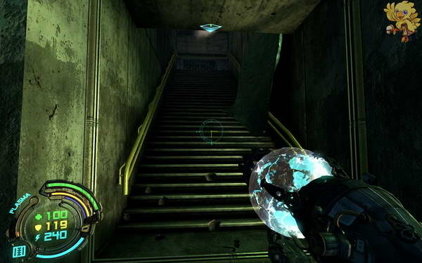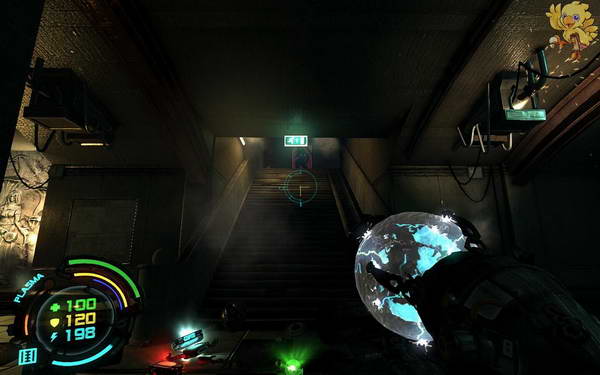 一出来我们往前走,清理几个小机器人,从楼梯间上去,上去后慢点,后面的门会冲出来个小boss,我们退回来,让他撞上前面的铁门。