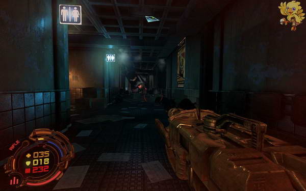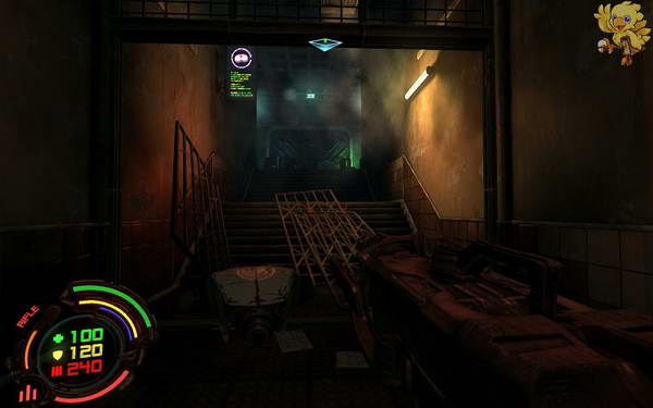 打开旁边的门从左边的楼梯间上去,上去后到达了刚才大厅的第三楼,从桥上过去,清理机器人,过去进入一个阴暗的房间,从前面的楼梯间下去。