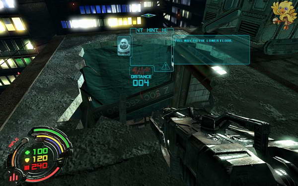 出去后往右走,进一个房间跳下去,会有很多人形机器人围攻过来,消灭完,打开那旁边的门,从楼梯间一直盘旋直下.。