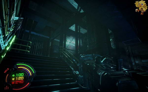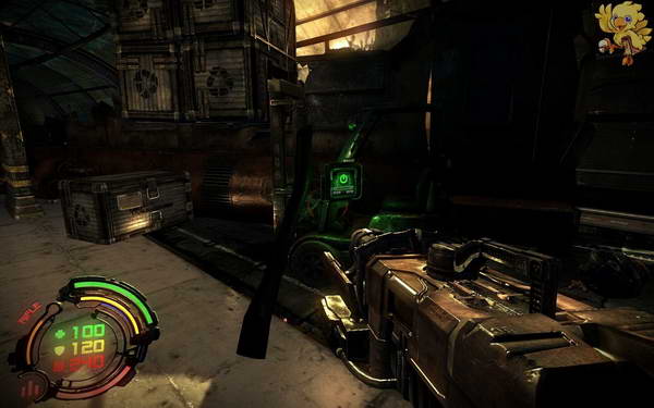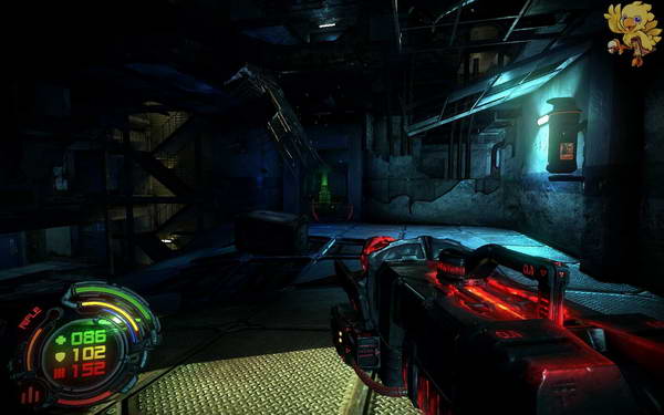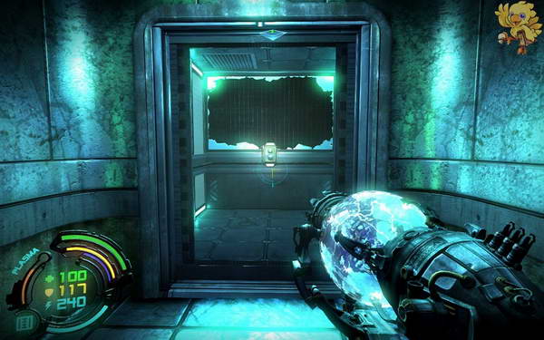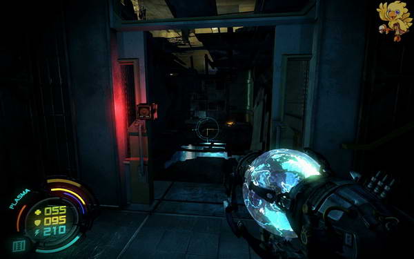 跳过去后进入窗口进旁边门,继续清理人形机器怪,这里也要打开两个电源开关,两边的房间里各一个,两个都打开后会像地震一样,抖动一会,然后我们从旁边的房间里那裂口处跳出去,沿着路往左走。
