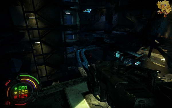 过去后跳入窗口进入旁边的电梯里,电梯到达后出去,清理人形机器人,然后沿着前面的管道走过去。