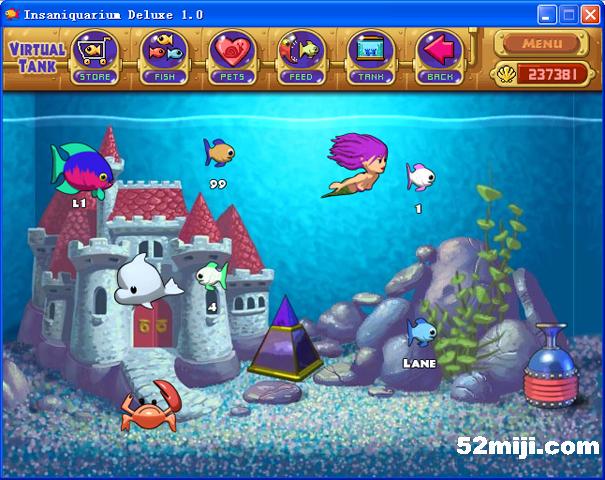 这里是真正你自己的世界!你所要做的第一件事就是去商店购买小鱼、更换背景或是作响赢得升级等等。但是要注意在这里所花费的钱可不是前三个模式中的金钱,而是以贝克来作为货币单位。开始的时候你只有200个贝克,但是你可以在完成前三个游戏模式的同时得到更多的贝克来构建你喜欢的水族乐园。你所买的小鱼都不会死,但是你最好每天喂食保持让它们的健康。