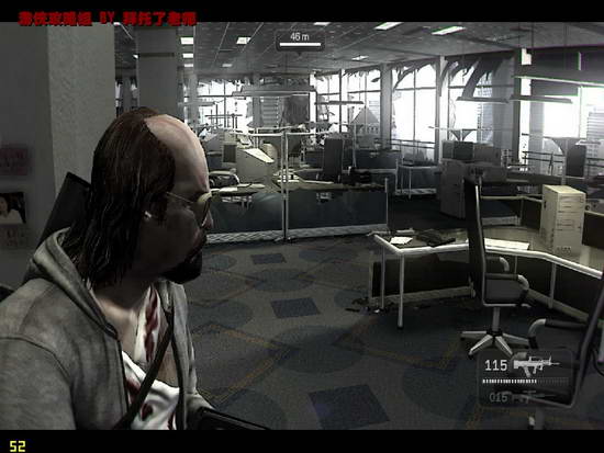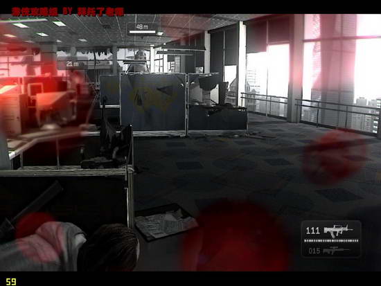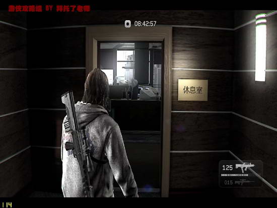 休息室中不但有大量敌人,楼外还有一架直升机。在消灭楼内敌人的同时,时刻关注直升机的行动,找好掩体躲避。最好是柱子,桌子会被打穿。