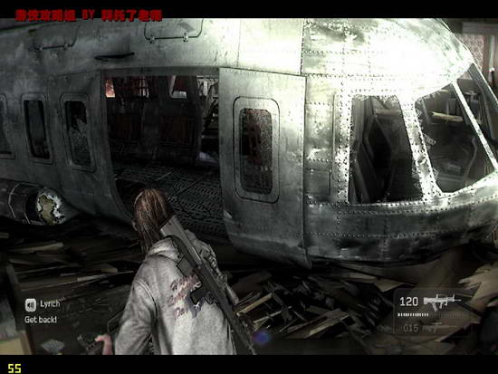 从厨房出来后,在一个大厅中发现一架直升机残骸,从中出现一批敌人