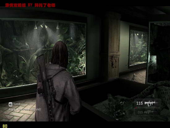 上楼后经过大厅,走廊的激战,进入一个陈列动物标本的地方。敌人较多,记得找好柱子、屏风等进行躲避。