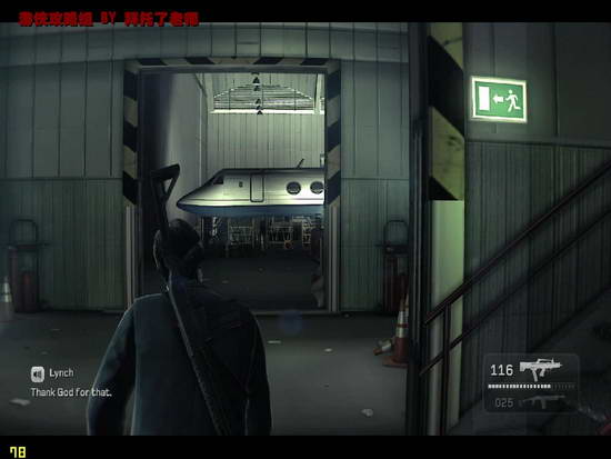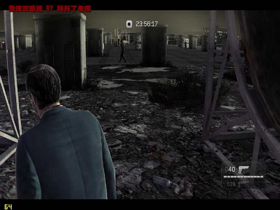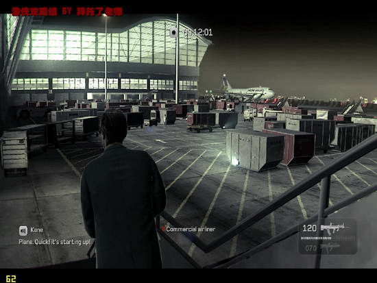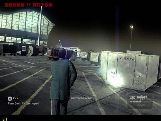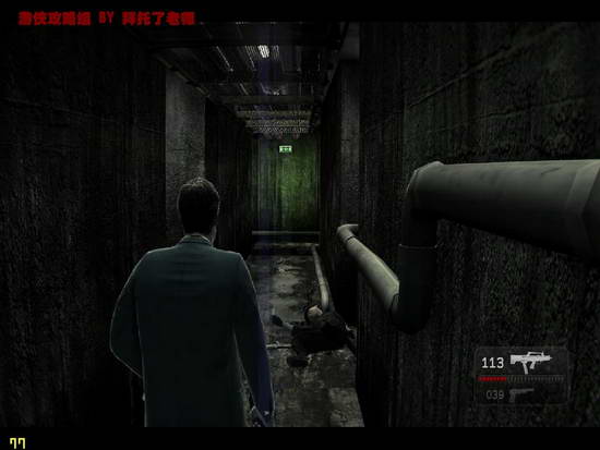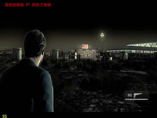 在经过房屋的拐角后,稍微放慢速度。左边会出现两条狗,对它们扫射。千万要在换子弹之前将它们击杀,不然在换弹药的时候,狗就会把你扑倒。在这个时候这种失误会使你没有时间赶上飞机。所以在遇到狗之前一定要换好子弹,而且不要浪费子弹