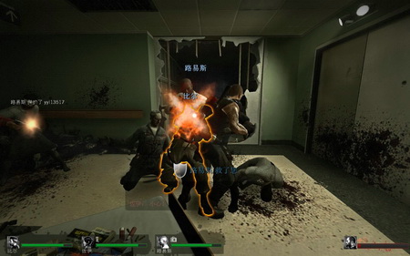 从楼梯进去,向着亮灯的地方走,拐过弯,上楼梯。这个大厅里有很多燃烧瓶,右边有挺机枪,先要打开对面的门,上面有个黄色惊叹号的就是。门开后,众多的僵尸冲了过来,还有TANK,要顶住哦。最好利用那挺机枪,不过,这枪打一会枪管就发红了,不能再用,稍等会冷却了才能继续使用。