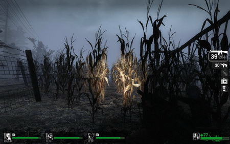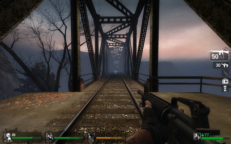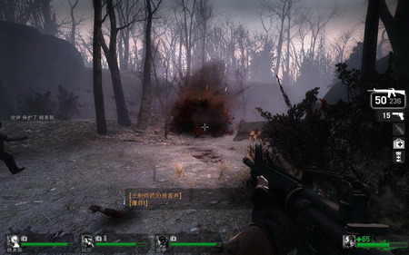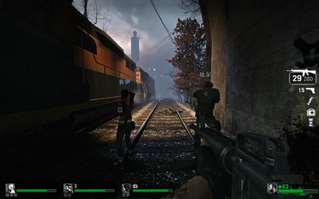 森林的场景,不禁让人想起了HL2第二章。军队在北边拿下了安全地带,只要沿铁路前进就行了。没想到森林里也这么多的僵尸,平常森林里应该没什么人的,这里僵尸的密度竟然能快赶上一个大城市了,晕!路很清楚,沿路走就行了。进入安全处所过关。