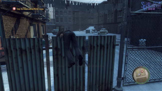 从出租车下车后看着地图向里走。路上有个大婶冲我们打招呼,即便Vito已经不记得他了,路上还能看到有几个小孩对着楼上的玻璃扔雪球,还有人家里打破窗户扔出来的酒瓶。最后来到公寓,上二楼,过场动画。