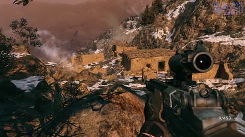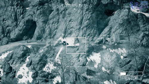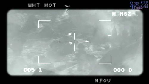 开枪之后子弹命中目标需要一直两秒,尽量在敌人不动的时候攻击。干掉一开始三个敌人后会有敌人狙击手向我们射击,可惜他枪法太烂,切换热成像模式找到他位置,就在刚才那三个人右边一点的位置,干掉他。