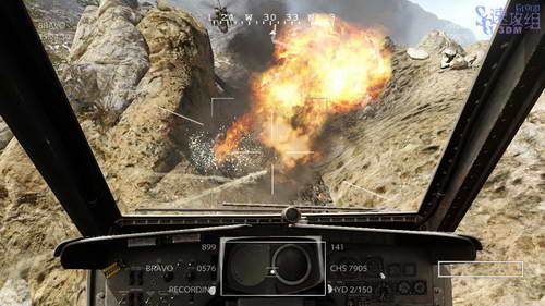 这一关是控制阿帕奇,不过能控制的也就是机枪和导弹。一开始低空飞行的时候干掉地面上敌人车辆,然后进入图中这种模式。