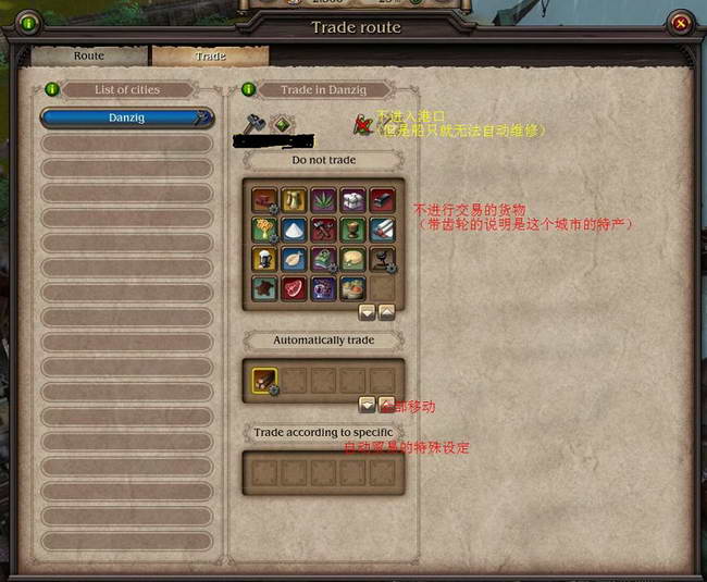 然后点击你要进行交易的城市,譬如下图的DANZIG。然后用鼠标左键选定你要交易的物品,下拉到下面的AUTOMATICLLY TRADE栏