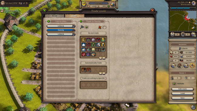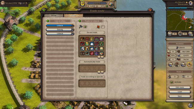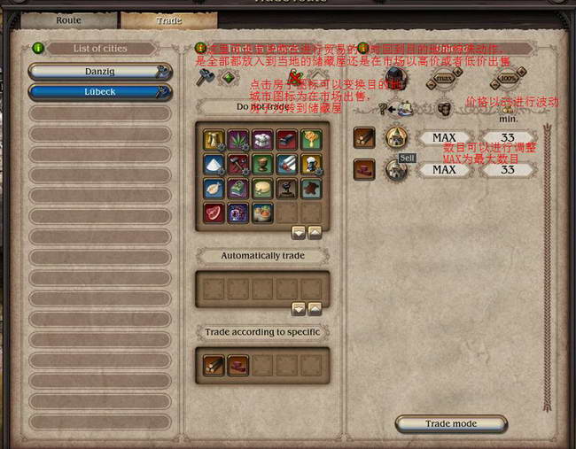 然后在点击LUBECK城市,同样将DO NOT TRADE栏里面的 刚才你在DANZIG选定的物品对应拉下来。那么你就完成了一个完整的自动贸易线路的进程
