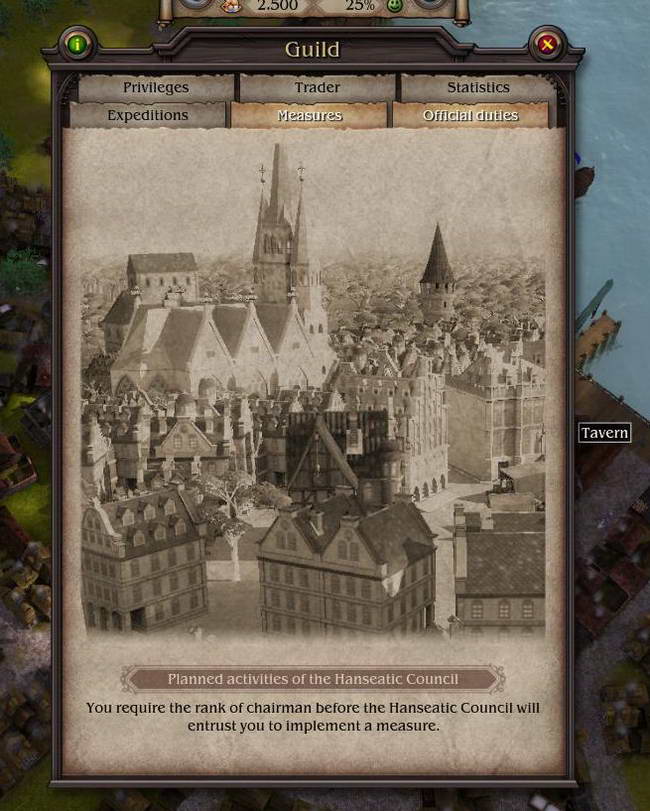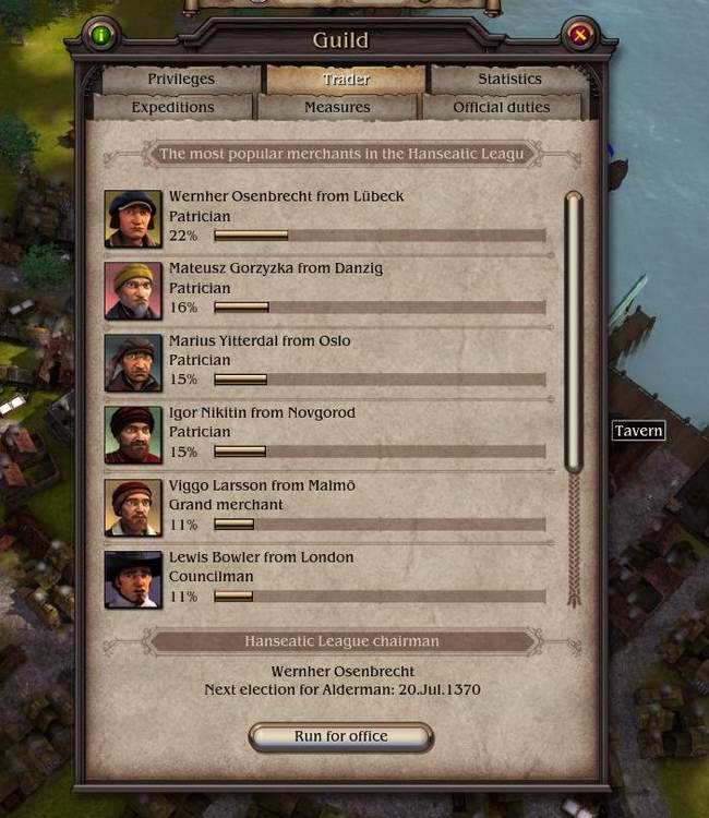 TRADER,在这里你可以看到你在汉撒同盟内与其他AI的势力概况,以百分比来表示。这里没什么要注意的,你倒是可以看一下汉撒同盟的主席选举的时间
