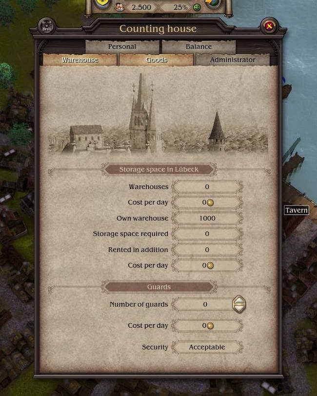 WAREHOUSE显示的是你目前储存货物的花费金额。下面的GUARDS选项则是你可以雇佣一些守卫来守卫你的货物。前期储存的货物少的话可以不用雇佣,后期货物多的话建议雇佣10到20个左右。如果有敌人来攻城的话,建议可以
