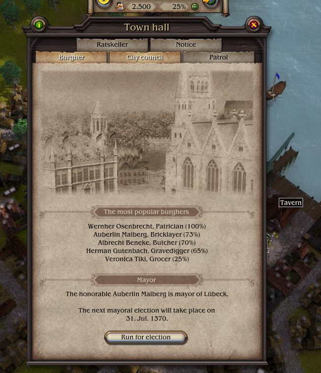 城镇大厅没有什么要注意的地方。这里你可以进行行贿和市长的参选