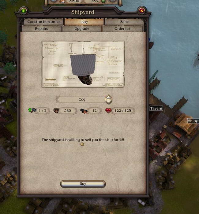 BUY,每个城市的船坞在一定时间内都有一定的船只供你购买,但是价格较高,而且船只血量都不是满的。但是这是前期你快速发展你的舰队最好的一个办法