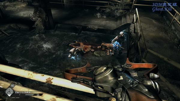接到任务之后从房间里进入下水道。来到下水道后遇到负伤的镇民,从他那里可以得到带电的弓箭, 这里的水很多,可以利用这个电死谁周围的敌人。