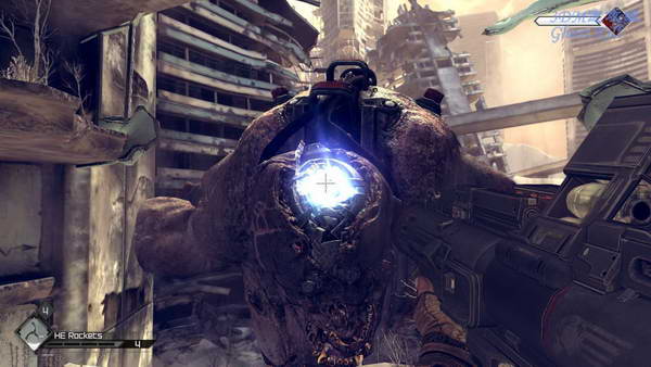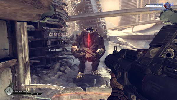 不出所料的,几层楼高的BOSS终于出现了,用火箭筒攻击他身上发蓝光的地方,等他去捡石头向这里扔的时候, 抬起手来的瞬间可以看到他肚子上发蓝光的弱点,但那时候在攻击就太晚了,必须预判位置,然后在他抬起手前射过去。